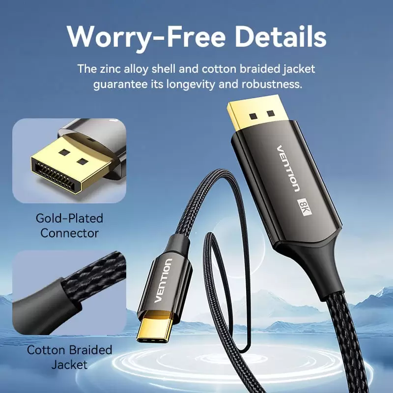 Cotton Braided 8K Bi-Directional USB-C Male to DisplayPort Male Cable 2M Black Zinc Alloy Type