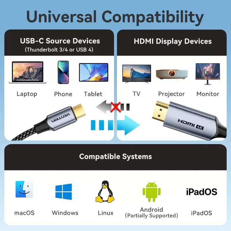 Cotton Braided USB-C to HDMI-A 4K HD Cable 1.8M Gray Aluminum Alloy Type